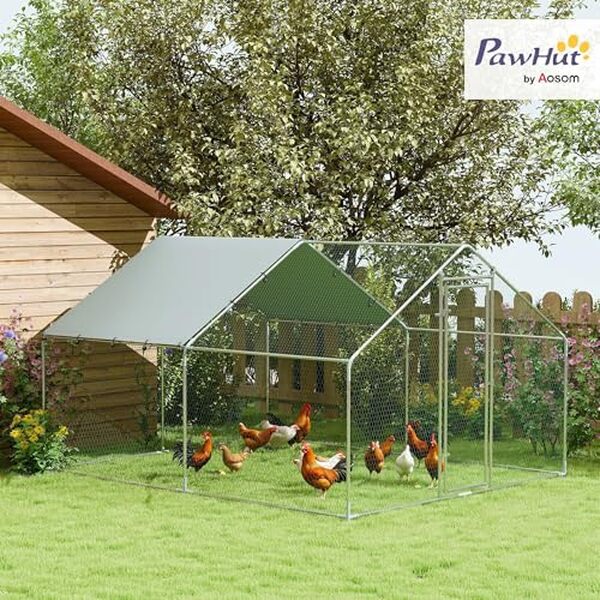 • PawHut Enclos poulailler, grand poulailler 10,2 m², enclos poule avec couverture imperméable et anti-UV, porte verouillable, cage en acier galvanisé, volière pour 10-15 poules, 3 x 3,4 x 1,9m, argenté